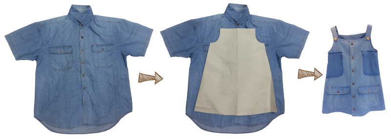 พิเศษ!!...ในคลิปจะเห็นว่ามีเอี๊ยมที่ทำจากเสื้อยีนส์ฟอกด้วยใช่ไหมคะ เป็นการรีเมคที่ทำจากเสื้อยีนส์ตัวเก่าของคุณป๊าค่ะ หากต้องการตัดแบบนี้ต้องทำการปรับแพทเทิร์นโดยก๊อปปี้ให้มีแพทเทิร์น 2 ด้านเท่ากัน แล้วค่อยไปวางหาตำแหน่งตัดบนเสื้อนะคะ