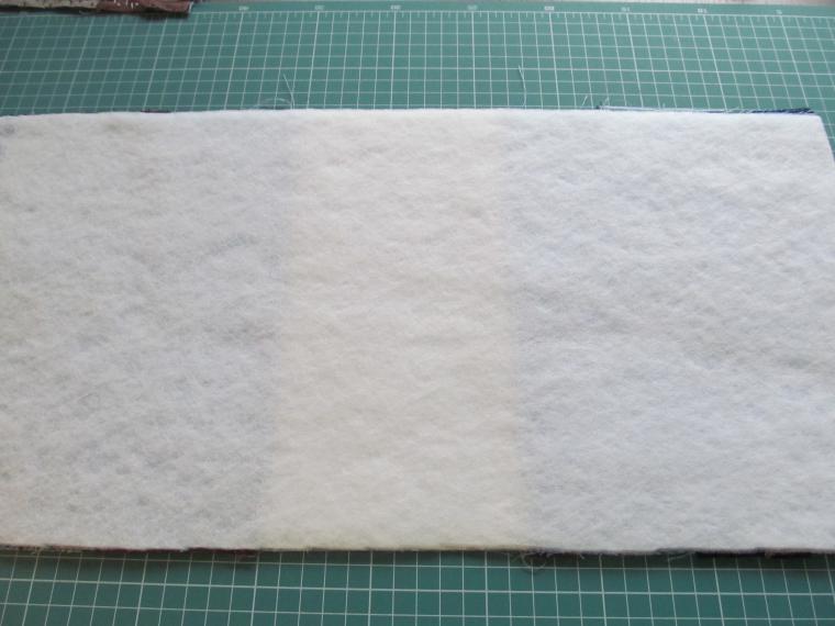 6. วางใยบุไว้ที่ด้านผิด เย็บล็อคตะเข็บเล็กๆ โดยรอบ และเย็บควิลท์จักรเป็นเส้นตรงที่ก้นกระเป๋า